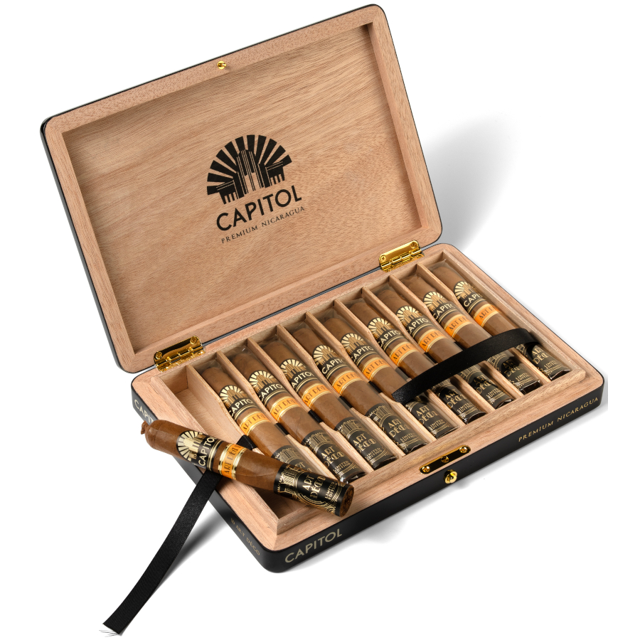 Mit der Capitol Art Déco Limited Edition präsentiert die Premium-Marke Capitol eine Kreation, die den Geist der „Roaring Twenties“ in sich trägt: luxuriös, selbstbewusst und geprägt von einer Ästhetik, die bis heute Maßstäbe setzt. Die charakteristische Formensprache des Art Déco, mit seinen klaren Linien, edlen Materialien und metallischen Akzenten, findet sich in jeder Facette dieser Edition wieder. Die Cigarren bestehen aus einer erlesenen 100-prozentigen nicaraguanischen Tabakmischung aus Estelí, Jalapa und Condega. Ihr Aroma eröffnet eine fein ausbalancierte Komposition aus Holz, Gewürzen und gerösteten Noten, ergänzt von Kakao, Vanille, Nüssen und Kaffee. Die Tiefe dieser Mischung entfaltet sich in einem vollmundigen, harmonischen Geschmack, dessen cremige Textur und elegante Süße den anspruchsvollen Aficionado unmittelbar abholen. Auch die Präsentation folgt höchsten Ansprüchen. Die hochglanzlackierte Holzkiste mit metallischen Art-Déco-Elementen unterstreicht die Exklusivität dieser Edition. Jede Vitola trägt zusätzlich einen zweiten, speziell gestalteten Ring, der ihre besondere Stellung innerhalb des Portfolios hervorhebt.